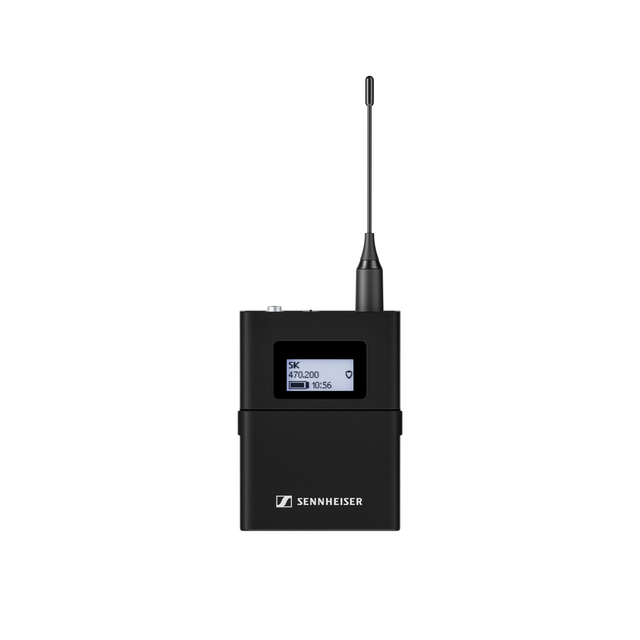 Digital wireless bodypack transmitter with 3.5 mm jack connector compatible with Evolution Wireless Digital systems. Rugged metal housing, up to 12 hours of runtime, persistent E-Ink display and charging contacts for in-device charging. Compatible with a wide range of Sennheiser lavalier and headset microphones.