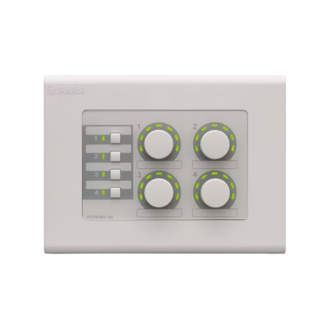 The Yamaha DCP4V4SEU Digital Control Panel is an EU-spec 1-gang wall-mount controller featuring four rotary volume knobs and four programmable switches for comprehensive remote control of MTX Series processors. It connects via a single CAT5 cable carrying RS485 and power, with support for up to eight DCP units per MTX processor. Ideal for installed sound applications, it provides intuitive management of multiple zones or sources, combining flexible functionality with a clean, professional appearance.